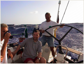 Der Passat ist wechselhaft in Stärke und Richtung, meist um Ost mit 18 bis 28 Knoten, also 5 bis 7 Beaufort. Daher läuft auch die See oder Dünung von entfernteren Gebieten gelegentlich quer zum Vorm-Wind-Kurs. Zeitweise fahren wir mit einem Reff, da das Schiff bei zu großem Segel noch leichter anluvt. Am Morgen gab es noch einen Sonnenschuss, der die Freiwache aus der Koje warf. Also wieder reffen. Wegen der fehlenden Backstagen und den profilierten Salingen kann das Großsegel nicht weit genug aufgefiert werden, so dass das Schiff in Regenböen unhaltbar hochdreht.