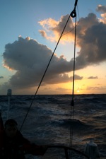 Wir denken, jetzt könne es immer so weitergehen. Das Wetter ist konstant. Gelegentlich ziehen ein paar Regenwolken mit den zugehörigen Winddrehungen auf. Aber wir wissen ja, dass morgen Landfall ist. Das Material wird schon irgendwie solange durchhalten. Die Ruderanlage macht nur auf Steuerbordbug Geräusche, auf dem anderen Bug ist sie ruhig. Vorsichtiges Steuern ist angesagt.