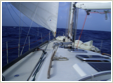 Kurz nach Mitternacht zerreißt der rote (Leichtwind-)Spinnacker, während ich am Ruder stehe. Das Schiff rollt in der Dünung bei 4 Beaufort. Da bleibt es kaum aus, dass er bei dunkler Nacht einmal