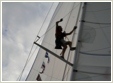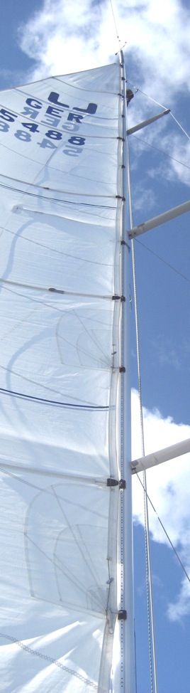 Beim Auswechseln der obersten Segellatte zeigt sich auch, dass das der Mantel des Großfalls an zwei Stellen etwa 6 und 8 Meter vom Schäkel entfernt zerstört wird (Bild oben rechts). Wir überkleben