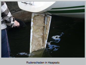 In Haapsalu lernen wir zwei extreme Seiten der momentanen estnischen Verhältnisse kennen. Beim Anlegen in dem schönen alten Kurort ereilt uns gegen 17 Uhr ein Unglück, bei dem wir zunächst denken, unsere Reise sei nun zu Ende. Beim Rückwärtsrangieren stößt das Ruderblatt so hart gegen einen unter Wasser versteckten Betonklotz, dass es der Länge nach zerbricht. Den nicht markierten Klotz hat ein privater Hafenbauer, der seine neue Marina wegen eines Rechtsstreits wieder schließen musste, ca. 1,6 m tief neben einer Festmacherpier auf dem Weg zum älteren Yachthafen ausgelegt, ohne Markierung oder Warnhinweis. Wegen dieser „Grand Holm Marina“ sind die Stege des Haapsalu Yacht-Clubs, wo wir noch vor zwei Jahren festmachten, für größere Boote nicht mehr erreichbar. Zu unserem Glück helfen uns aber jugendliche Segler und ein Bootsbauer mit einem unglaublichen Einsatz. Noch am selben Abend wird das Heck unseres Bootes an einer Fischkutterpier mit einem Autokran hochgehoben und das Ruder ausgebaut. Über Nacht laminiert Herr Valdo Viilustu die weggeschwommene Ruderblatthälfte mit Kohlefasermatten wieder auf die andere Hälfte und das runderneuerte Ruderblatt wird am nächsten Nachmittag eingesetzt. Eine unglaubliche Leistung, und das alles zu einem sehr günstigem Preis. Das Ruder arbeitet bis heute einwandfrei.