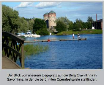 Die Tage auf dem Saimaa, mit über 4000 qkm der größte finnische und viertgrößte europäische Binnensee, sind in dieser Zeit der hellen Nächte wunderschön. Der zerklüftete, umwaldete See ist ein schönes Segelrevier und lädt wegen der relativ warmen Temperaturen zum Baden ein. Es gibt 3000 km lange Schiffsrouten, alle hervorragend mit Tonnen und Peilmarken ausgestattet. Überall verstecken sich Sommerhäuser im Wald. Wir dürfen in einem traumhaften Ferienhaus von Freunden nächtigen und die holzbeheizte Sauna mit dem anschließenden Bad im See genießen. Zum Essen gibt es selbst gesammelte Pfifferlinge und frischen Fisch. In der mittelalterlichen Trutzburg Olavinlinna von Savonlinna, die die damalige schwedisch-russische Grenze schützte, sehen wir großartige Inszenierungen der Verdi-Opern Rigoletto und Aida, wofür wir die Karten schon Monate vorher im Internet gekauft haben. Wiederholt begegnen uns große Holzflöße, die zu der Papierfabrik in Lappeenranta geschleppt werden.