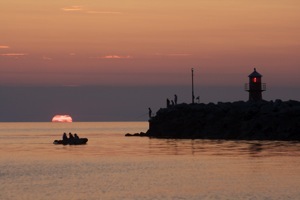 Zu zweit brachen wir am 27. Juni 2009 gegen 11 Uhr von Strande aus auf und erreichten bei kräftigem Nordost nach einer Kreuz über die Kieler Bucht und anschließender schneller Fahrt mit Strom um 18 Uhr Spodsberg. Auch am nächsten Tag trug uns der Strom schnell nordwärts durch den Großen Belt, wobei der Wind allerdings am Nachmittag einschlief, so dass wir erst gegen 21 Uhr auf Sejerö festmachten. Bei Sonne und Windstille erkundeten wir mit unseren Bordfahrrädern diese schöne Insel. Gegen einen leichten Nordostwind kreuzten wir dann mit langen Schlägen gen Anholt. Da wir die Insel wieder erst kurz vor Sonnenuntergang erreichten, ankerten wir über Nacht vor dem Strand südlich der Mole. Nach einem sonnigen Hafentag auf Anholt starteten wir bei flauen nördlichen Winden nach Norden. Erst nach einer Badepause setzte sich am Nachmittag ein stetiger Nordwind durch, der uns schließlich gegen neun Uhr abends bis Vrangö vor Göteborg trug. Anschließend verbrachten wir einen heißen Sommertag in Göteborg, wo wir im Stadthafen Lilla Brommen festmachten.