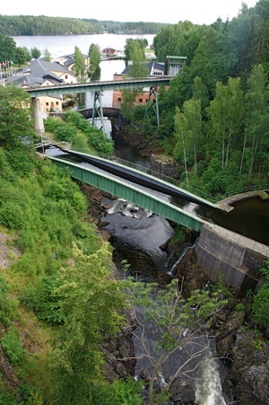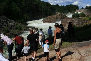 In einem Anlieger konnten wir am nächsten Tag von Klitt aus Vänersborg erreichen und machten nach 8 Tagen im Vänersee in Spikö bei Trollhätten fest. Hier werden im Juli täglich um 15 Uhr für 10 Minuten die Tore zum alten Canyon der Göta Alv geöffnet, die sonst die Turbinen zweier Kraftwerke antreibt. Mit einem gewaltigem Getöse donnern dann 400 Kubikmeter Wasser pro Sekunde insgesamt 32 m tief durch die Schlucht. Das Spektakel konnten wir bei Sonnenlicht von der Oskarsbron nicht weit vom Liegeplatz gemeinsam mit einer großen Menschenmenge beobachten. Bis 1800 bildeten diese Wasserfälle das größte Hindernis für die Schifffahrt auf der Göta Alv, dem wasserreichsten und nun meist befahrenen Fluss Schwedens. Man kann hier drei Generationen von Schleusenkammern besichtigen.
