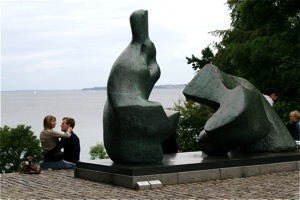 Am Nachmittag stiegen wir noch die vier hohen Schleusenstufen nach Akersvass hinab, um dann am nächsten Tag stromabwärts bis Langedrag zu fahren, wo wir bei einem Wolkenbruch einliefen. Eine Reihe von Tiefdrucksystemen erwarteten uns nun im Kattegat, so dass wir uns bei südwestlichen Winden entschieden, den Weg zurück entlang der schwedischen Westküste und durch den Sund zu nehmen. In Varberg besuchten wir die alte Festung und ein Stadtfest. Glommen bei Falkenberg liefen wir an, um im sicheren Hafen den angesagten Starkwind aus Nordost abzuwarten, der aber nicht kam. Mit mäßigem Ostwind und viel Regen segelten wir dann nördlich eines Gewittertiefs über der westlichen Ostsee nach Gilleleje, bis uns beim Segelbergen unmittelbar vor dem Hafen noch eine Regenfront mit West 7 erwischte. Bei Schauerwetter segelten wir tags darauf nach Humlebæk, um dort einen halben Tag in dem wunderschönen Louisiana Museum hoch über dem Sund zu verleben. Dafür war das Rückfrontwetter ideal. Als abzusehen war, dass auch für die kommende Woche mit andauerndem Starkwind aus Südwest zu rechnen war, entschlossen wir uns, unsere Heimreise zu unterbrechen, denn wir hatten zu Hause wichtige Termine. Am 20. Juli legten wir das Schiff in Skovshoved, einem nördlichen Vorort von Kopenhagen, an die Leine und fuhren mit der Bahn nach Kiel.